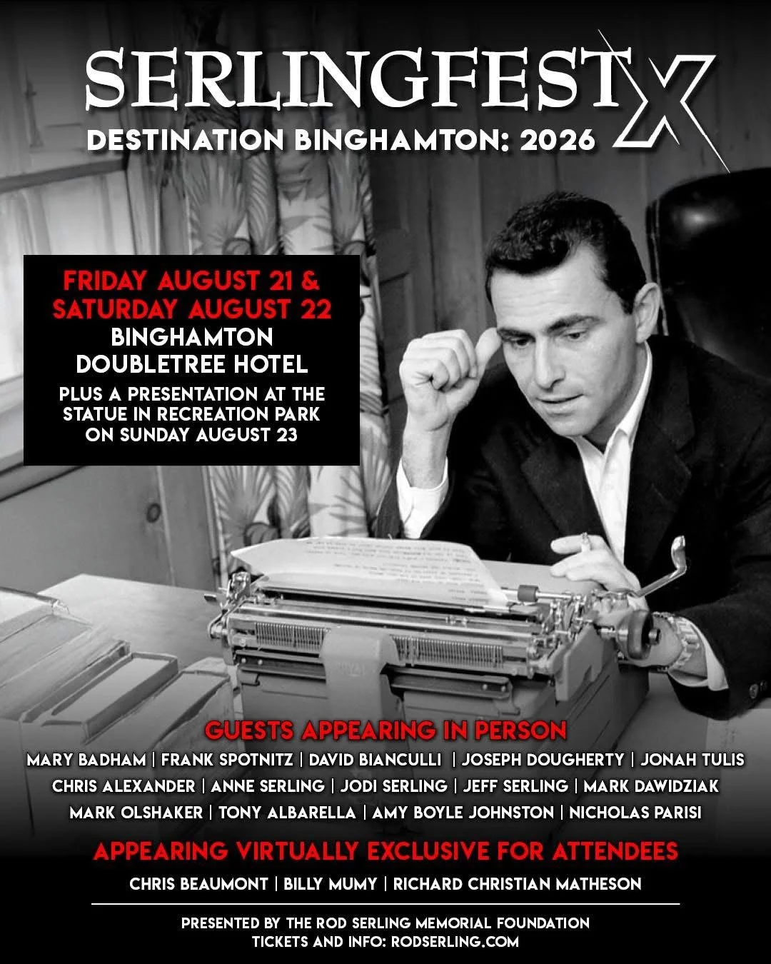 DECEMBER 31st, 2025 - Chris Alexander will join actress Mary Badham (TO KILL A MOCKINBIRD, THE TWILIGHT ZONE episode “The Bewitchin’Pool”, author Anne Serling and many other guests for the 10th annual SERLINGFEST in Binghamton, New York, August 21st and 22nd, 2026. The event celebrates writer and THE TWILIGHT ZONE creator Rod Serling in his hometown, with several events, lectures, screenings and more. Tickets are on sale HERE.